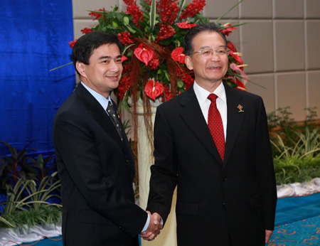 Chinese Premier Wen Jiabao (R) meets with Thai Prime Minister Abhisit Vejjajiva in the southern Thai resort town of Hua Hin, Oct. 25, 2009. (Xinhua/Liu Weibing)