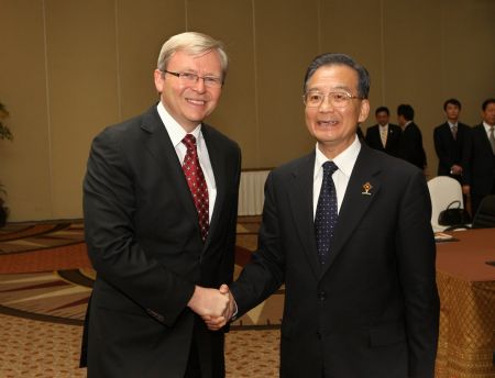 Chinese Premier Wen Jiabao (R) meets with Australian Prime Minister Kevin Rudd in Hua Hin, Thailand, October 24, 2009. Wen Jiabao and Kevin Rudd are here to attend a series of leaders' meeting related to the Association of Southeast Asian Nations (ASEAN).(Xinhua/Liu Weibing)