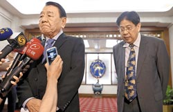 菲律宾总统特使裴瑞兹(左)15日晚间拜会台当局“外交部”后,面色铁青地强调自己代表菲律宾总统来向“广大兴28号”事件受害者洪石成的家属表达深刻歉意。白熙礼(右)则表情凝重陪在一旁。(图片来自:台湾《中国时报》)