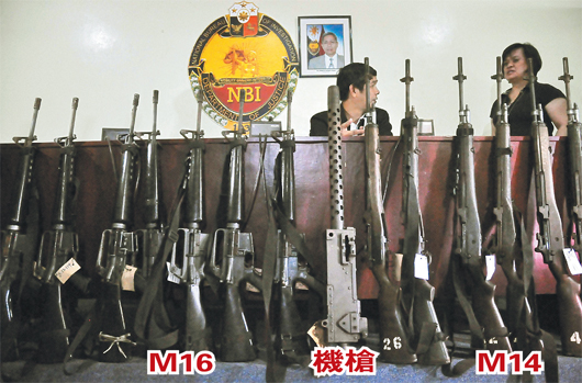 菲律宾国家调查局17日在马尼拉总部召开记者会前,展示一批由菲律宾海岸防卫队交给调查人员的武器,菲律宾枪击台湾渔船广大兴28号的武器就在其中。图中为布朗宁机枪,左边七把为M16步枪,右方六把为M14步枪,这两型枪枝在越战时期均被广泛使用。(图片来自台媒)