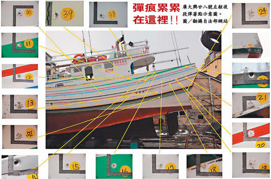 广大兴28号左舷后段弹着点示意图。(图片来自台媒)