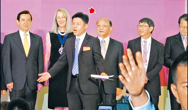 男子(箭头处)趁马英九与台中市长胡志强等人合影时冲上主席台用英文抗议,台下随扈(右前)没听懂陈说内容,忙着遮挡记者拍照角度。(图片来自台媒)