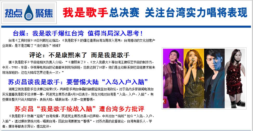 《我是歌手》总决赛,4名台湾唱将引发岛内广泛关注,多家电视台也因此予以大篇幅报道。(图片来源:中国台湾网)