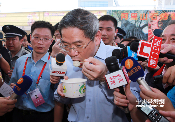 6月16日下午,中共中央台办主任张志军在第五届海峡论坛期间走进台湾特色庙会,了解台湾业者经营情况,品尝原汁原味的台湾小吃,大赞好呷(闽南语:好吃)! (中国台湾网 田云鹏 摄)
