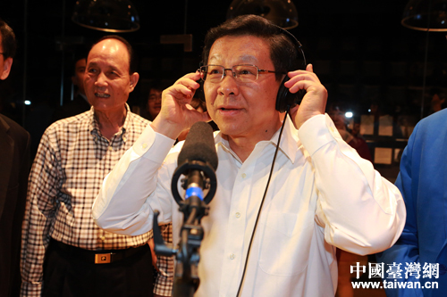 20日下午,海协会会长陈德铭夫妇与海基会董事长林中森夫妇一起在沪参观了上海电影博物馆与东方明珠。他们在参观中尝试电影配音、体验摄影棚录像,并详细了解了上海的历史发展。图为陈德铭体验电影配音。(中国台湾网 王伟 摄)