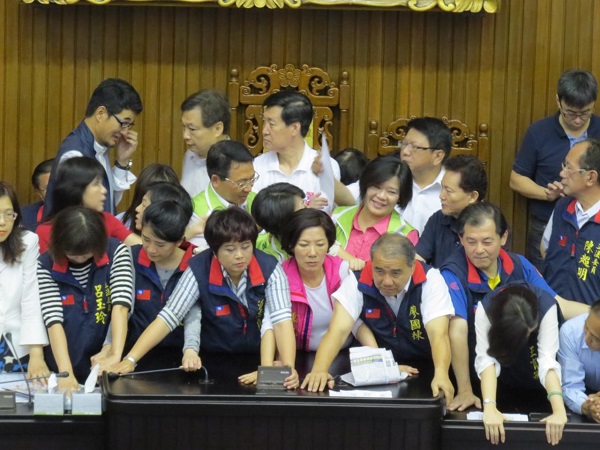 中国台湾网6月25日消息 据台湾“中广新闻网”报道,今天是台湾“立法院”本次临时会的最后一天,而为了让证所税、12年义务教育及核四“公投案”能过完成“二、三读”程序,国民党“立院”党团今天发出行动,一早6点40分就占据了议场主席台。不过在野党也不示弱,不到7点,也进入会场表达不满,双方还一度发生推挤冲突,并且持续对峙中。