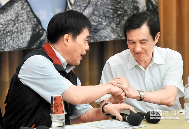 郝朱胡挺马,马英九(上图中)为连任国民党主席全力冲刺,恳托会上台北市长郝龙斌(左二)、新北市长朱立伦(右二)及台中市长胡志强(左)联袂力挺高票连任。图片来源:台湾《中国时报》