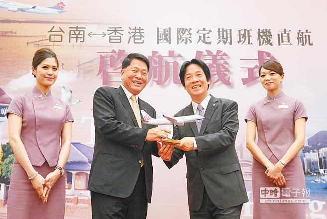 赖清德在仪式上说,两地开通直航后,一方面要鼓励台南市民到港旅游,另一方面也欢迎香港民众到台南市。