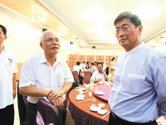 台湾中华统一促进党总裁张安乐(右)昨天到左营会面当地里长。(图/台湾《联合报》)