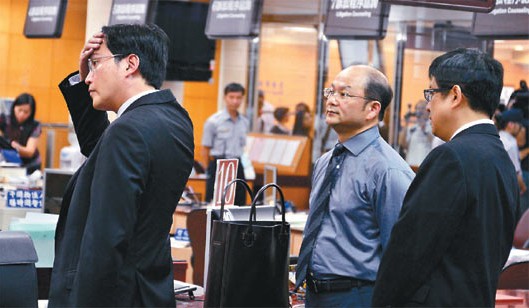 针对“立法院长”王金平假处分案,国民党委任律师林合民(前排右起)、陈明与李永裕昨天赶在台北地方法院下午五点半下班前递状抗告,希望法院撤销原定暂时状态的假处分。