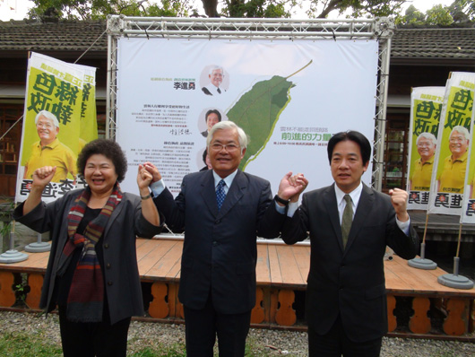 高雄市长陈菊(左)、台南市长赖清德(右)今天下午同台为参加民进党云林县长初选民调李进勇(中)站台。(图片来自台媒)