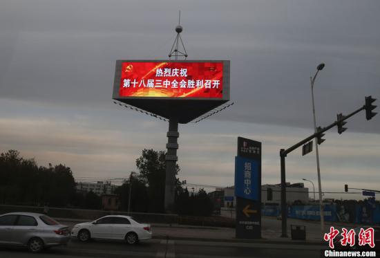 11月9日,中共十八届三中全会召开,北京街头一大幅广告牌上打出“热烈庆祝第十八届三中全会胜利召开”的标语。中新社发 刘关关 摄
