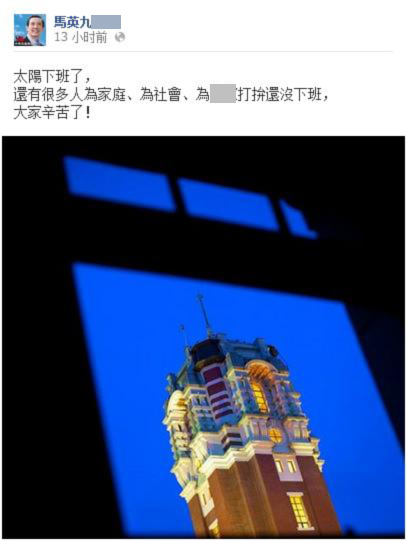 马英九的脸书大多是PO出前一天重要场合的公开发言,或针对特定纪念日发文,少有短讯,但12日下班时间却发文说:“太阳下班了,还有很多人为家庭、为社会、为台湾打拚还没下班,大家辛苦了!”,结果却遭到岛内网友痛骂,指责他不知民间疾苦。(图片来源:马英九个人脸书网页)
