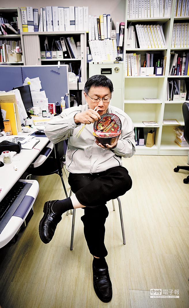 接受专访的这天深夜,柯文哲匆匆走进台大医院“叶克膜小组”办公室,随手抓了碗泡面当晚餐,随兴的他翘着二郎腿“狼吞虎咽”,展现有别于一般政治人物的性格。(图片来源:台湾中时电子报)