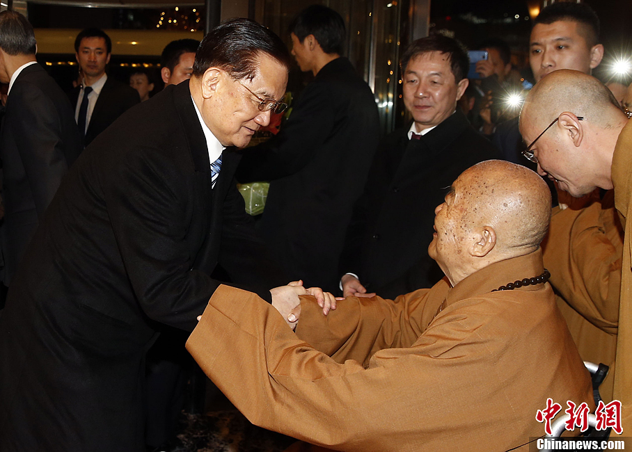 2月17日,中国国民党荣誉主席、两岸和平发展基金会董事长连战率台湾各界人士访问团抵达北京参观访问。图为连战在金融街威斯汀酒店和星云法师握手。