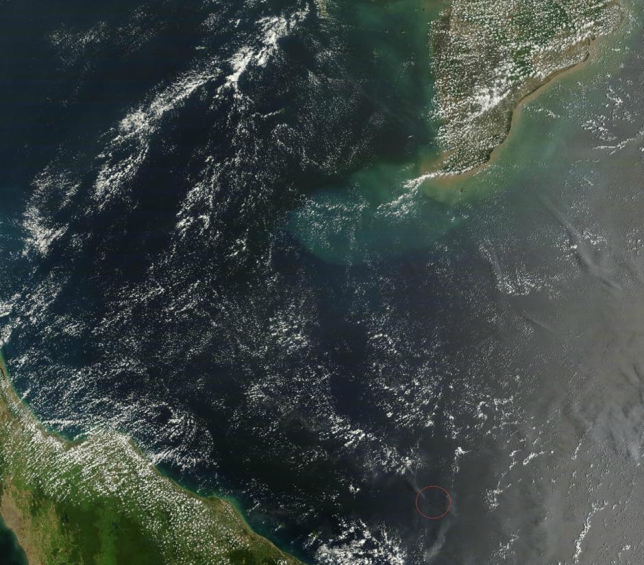 据美国宇航局发布的图片显示,北京时间3月9日11:35,NASA的卫星Terra/MODIS拍摄了相关海域的一张250米精度的卫星图像,图片定位约在104.6 E,6.1 N。图片来源:NASA网站