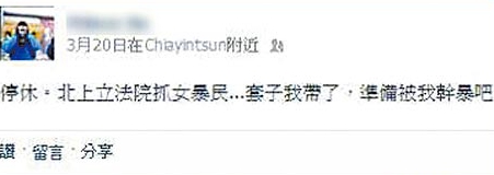 中国台湾网3月26日消息 据台湾媒体报道,台民众冲击“行政院”风波造成警民百余人受伤,有警员因不满休假被召回,在网络留言直指学生是暴民,甚至贴文“套子我戴了准备被我干爆吧”,遭到肉搜。