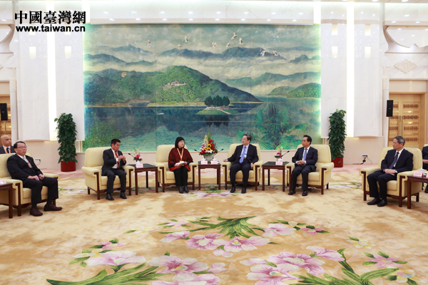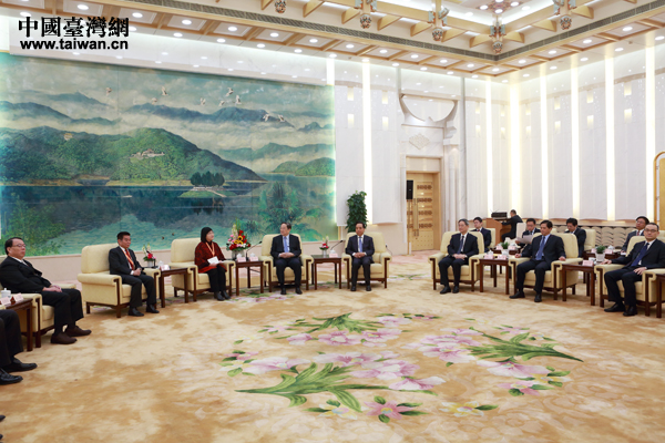 16日上午,俞正声在北京人民大会堂会见了出席“2014海峡两岸工会论坛”的台湾工会界代表。图左为海峡两岸劳工发展交流协会理事长侯彩凤 。(中国台湾网 于斯文 摄)