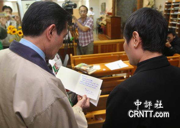 马英九转交给林义雄的卡片写着,“义雄先生,请您保重身体,我愿代表‘政府’承诺:核四经台湾内外专家严格安检后,交由‘全民公投’来决定它的未来。”他同时在留言簿上签名为证。