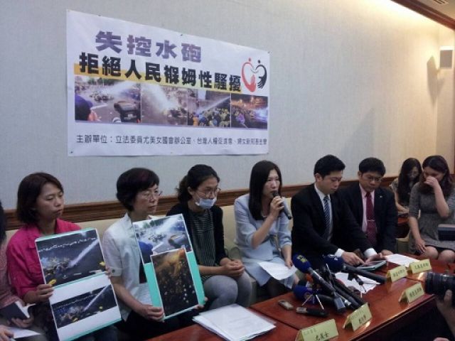 中国台湾网5月12日消息 据台湾今日新闻网报道,民进党“立委”尤美女、妇女新知基金会、台湾人权促进会等团体今(12)日举行记者会。发起人指称反核团体于4月27日举办“停建核四、还权于民”游行,当天在台北市长郝龙斌要求限时清空忠孝西路的命令下,警方以强力水柱驱离现场民众。其中警方“刻意”针对一女学生持续喷水,造成该女学生背部挫伤、瘀青、肾脏受损、血尿等伤害。事后警方更违反侦查不公开原则,不仅将女学生走光影片在内部流传,还外流至youtube等网站,严重侵害女学生隐私权,已委请义务律师对警方提出刑事与民事赔偿告诉。