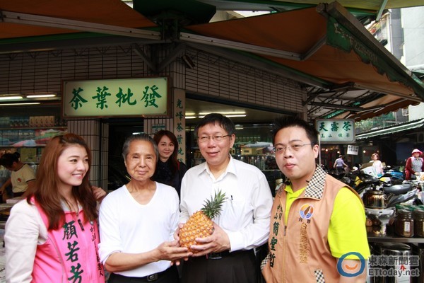 柯文哲13日上午赴台北荣滨市场拜票,摊贩送上菠萝(旺来)表达支持。(图片来自台媒)