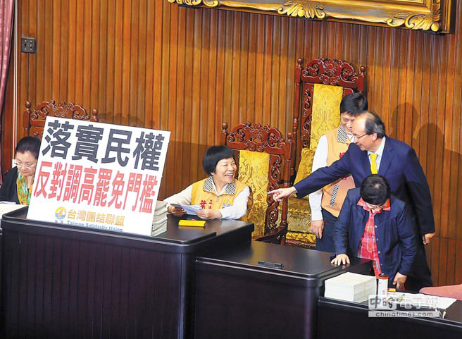 台联党、民进党“立委”昨天一早就抢先进入议场,联手霸占主席台,并摆放“鸟笼罢免法,阉割人民罢免权利”、“可耻国民党,阉割民权,修法提高罢免难度怕什么?”等标语,要求国民党团应将“监督条例复议案”及提高罢免技术门槛的“选罢法”从议程中撤案。