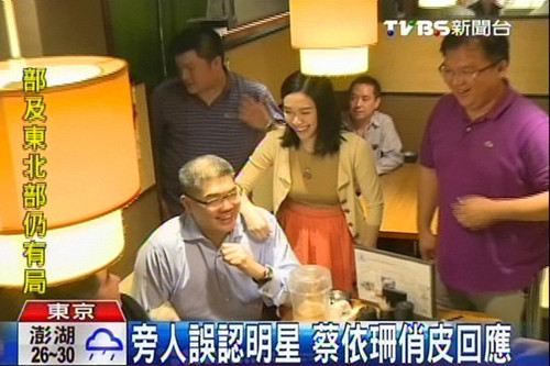 报道说,在餐聚的欢乐气氛当中,蔡依珊比较自在,但还是有一点害怕镜头。在东京,蔡依珊没有陪连胜文跑行程,她说自己走走逛逛,给孩子买了蚊虫药。