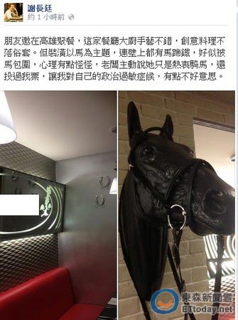 中国台湾网6月1日消息 据台湾“东森新闻”报道,2008年曾与马英九角逐大位的前台当局“行政院长”谢长廷,31日下午在脸书发文,指自己去一间以“马”作为装潢主题的餐厅用餐,不过,看见周围都是马的装饰,感觉就像是“被马包围”,内心不禁有点怪怪。但餐厅老板主动示意,表示曾投票给他,谢对于自己的“政治过敏症”感到不好意思。