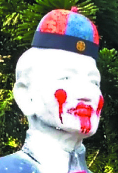 蒋介石铜像被戴上瓜皮帽、脸涂成白色,脸颊有红色血迹,变成“殭尸”铜像。图自台湾《联合报》/罗东高中提供