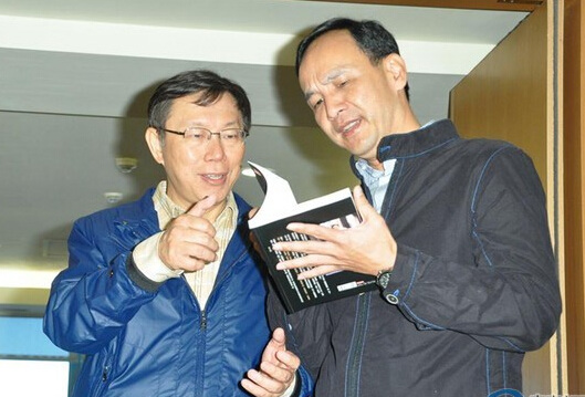 柯文哲、朱立伦选后首度会面,两人互赠彼此著作。(图片来源:台湾东森新闻)