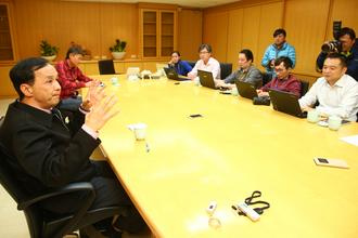 新北市长朱立伦今天透过网络宣布参选中国国民党主席,同时宣布2016年台湾“大选”不会竞选。朱立伦今天下午在新北市长室,接受媒体访问。