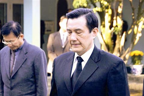 结束追思默哀后,马英九转身,可以看到身心极度憔悴,但知道有媒体闪光灯聚焦在他身上,又不得不努力让嘴角上扬,勉强自己让外界看到坚强一面。