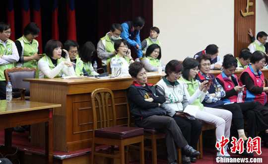资料图:2014年3月17日,台湾立法机构8个常设委员会联席初审海峡两岸服务贸易协议,从中午起,朝野“立委”在立法机构大礼堂发生数波冲突。图为朝野“立委”抢占主席台。中新社发 陈立宇 摄