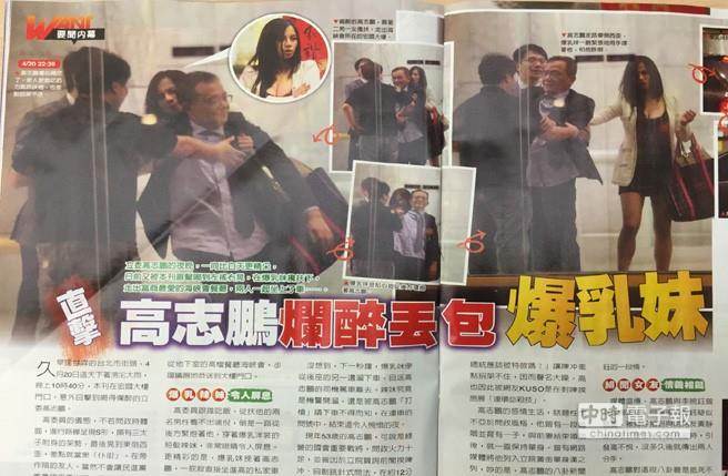 高“委员”跟谁吃饭?从扶他的两名男性看不出端倪,倒是一路从后方紧抱着他、穿着爆乳洋装的短发辣妹,非常吸睛、令人屏息。报道称,该女子穿著短裙低胸洋裝,从后方环抱高志鹏,将他扶进骄车,自己也一屁股直接坐进高的私家车后座,令记者期待,莫非高委员要“打包”辣妹回府?