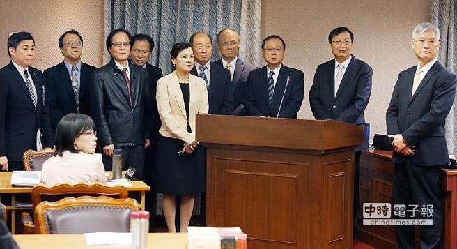 台湾“立法院内政委员会”5月6日邀请相关官员项目报告国民党主席朱立伦访陆行之适法性,台上陆委会主委夏立言(右起)、“内政部长”陈威仁、“铨叙部长”张哲琛、“经济部长”邓振中及6位参与国共论坛的台当局官员一度排排站备询。(中时电子报图 姚志平摄)