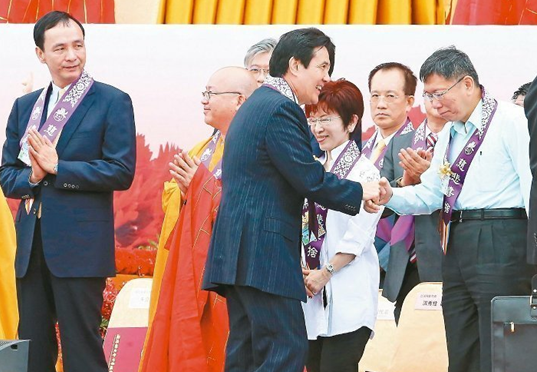佛光山昨天在马办前凯达格兰大道庆祝佛诞节,政界要角全到齐。马英九到场时和台北市长柯文哲等现场来宾一一致意。记者胡经周/摄影 图片来源:台湾《联合报》