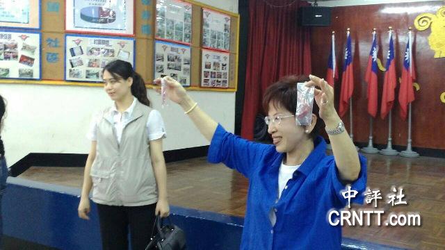 洪秀柱18日南下高雄果贸社区举行居民座谈,手拿居民赠送的辣椒。(记者 高易伸摄)