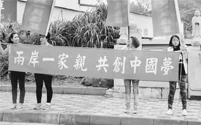 金门乡亲打起横幅欢迎。人民日报记者 吴亚明摄