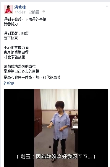 据台湾“中时电子报”报道,在这段玩剑玉的影片中,一开始洪秀柱不熟悉,接不到球。但经由不断练习、挑战,小心地掌握力道,专注地看准目标,最后终于准确接起球,成功率也愈来愈高。