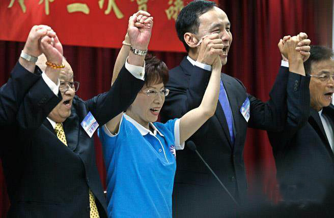 朱立伦松口,不会推辞担任洪秀柱竞选总部主委。图为7月20日国民党举行中评会,朱立伦(右二)在会中高举总统参选人洪秀柱(左二)的手,为她加油打气。(图片来源:台湾中时电子报)