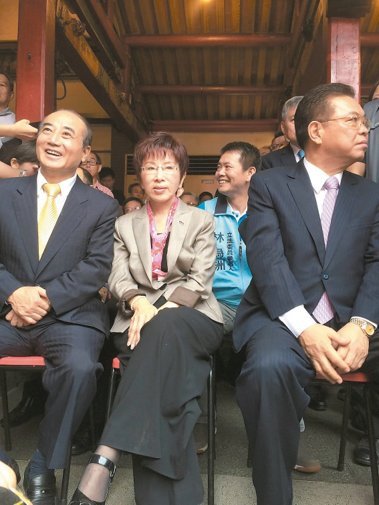 国民党2016参选人洪秀柱(图左二)与“立法院长”王金平(图左一)一同参访新竹义民庙,民进党参选人蔡英文也到场,蓝绿对决,硝烟味十足。(《联合晚报》 叶建宏摄)