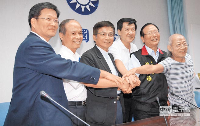 洪秀柱版证所税推翻当初号称“社会公义”的蓝版“证所税修正案”,在野党批马政策反复。图为2013年6月25日“立法院会”国民党优势表决通过“证所税案”,“财政部长”张盛和(左二)前往国民党团致谢。(《中国时报》图)