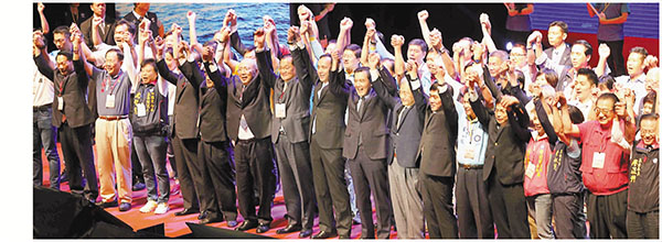 临全会闭幕,中国国民党全体党代表举手高呼团结。 图片来源:中新社