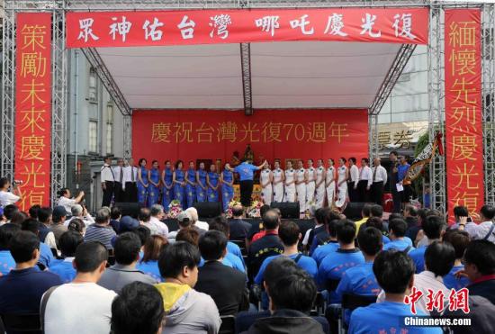 10月25日,多个民间团体在台北中山堂、凯达格兰大道等地举办庆祝台湾光复70周年活动。其中,中华统一促进党在中山堂广场祭祀两岸抗日烈士英灵,祈愿两岸和平团圆,并结合各地民间信仰团体在传统老城区举办巡游活动。(中新社记者 任海霞 摄 )