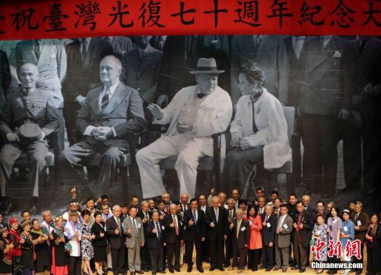 10月25日,台湾方面在日本受降所在地台北公会堂(现中山堂)举行光复70周年纪念大会。社会各界以及台湾抗日志士、先贤先烈家属代表等千余人出席活动。台湾当局领导人马英九出席纪念大会致辞并与台湾抗日志士、先贤先烈家属代表合影留念。中新社记者 任海霞 摄
