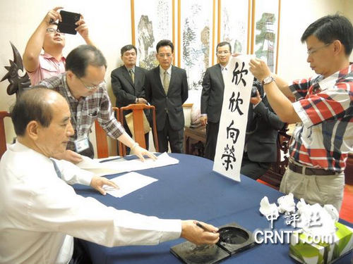 9日上午,王金平利用空闲时间挥毫写下“欣欣向荣”四个字,当做明年春联题字。(图自中评社)