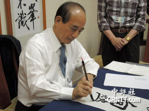 9日上午,王金平利用空闲时间挥毫写下“欣欣向荣”四个字,当做明年春联题字。(图自中评社)
