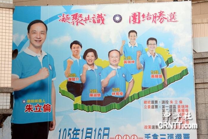 朱立伦与5位台南市立委参选人的文宣照组合。(中评社 赵家麟摄)