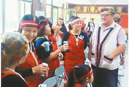 山地原民“立委”参选人瓦历斯贝林(右),穿原民图腾背心跑摊。来源:台湾《联合报》