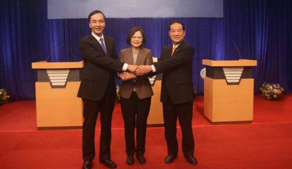 首场2016候选人电视政见发表会25日晚间时举行,亲民党宋楚瑜(右起)、民进党蔡英文、国民党朱立伦依序发言。(图片取自台湾中时电子报)